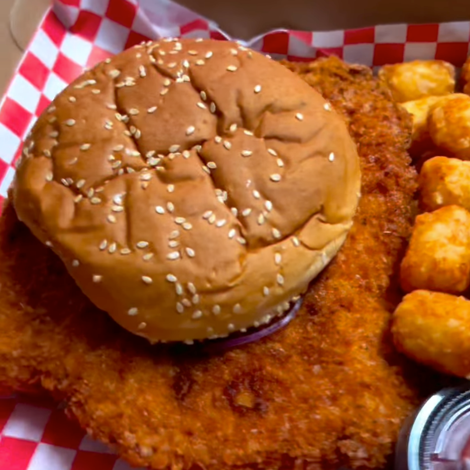 A Midwest-style breaded pork tenderloin sandwich known for its oversized cutlet that extends well beyond the bun.